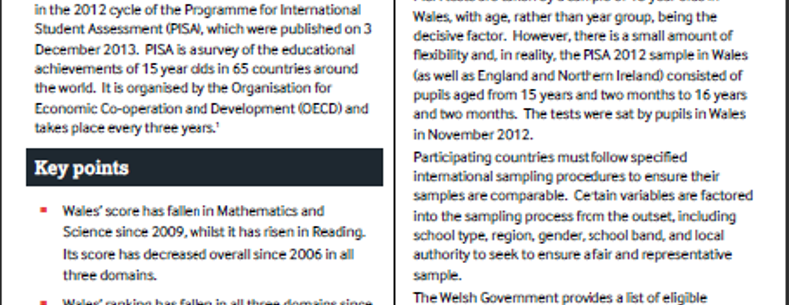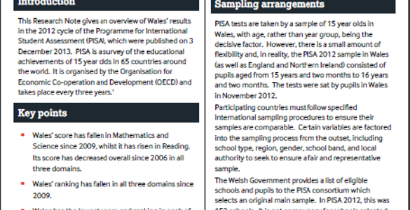 National Assembly for Wales Research Service This Research Note gives an overview of Wales’ results in the 2012 cycle of the Programme for International Student Assessment (PISA), which were published on 3 December 2013.  PISA is a survey of the educational achievements of 15 year olds in 65 countries around the world.  It is organised by the Organisation for Economic Co-operation and Development (OECD) and takes place every three years. Programme for International Student Assessment (PISA) 2012 blog-eng