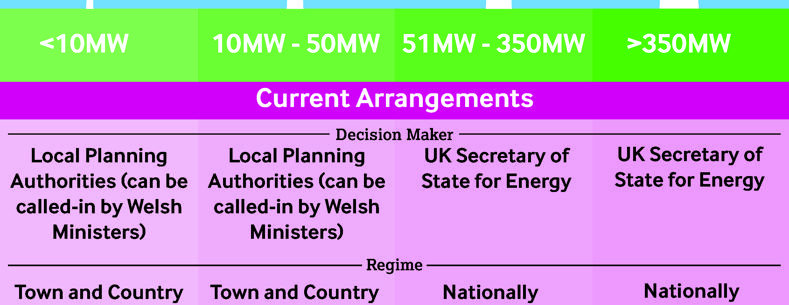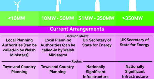 DNS may also be identified through the National Development Framework, a new development plan for Wales that the Welsh Government will be producing. The Welsh Government originally proposed including energy generating stations of between 25-50 Megawatts, but has now revised this definition to include all energy generating stations of between 10-50 Megawatts. The Welsh Government says this is in response to comments from the energy generation industry in order “to address the shortcomings identified in the current consenting regime for projects of all output levels and to reflect the relative scale of projects in Wales”. This means that any onshore energy generation station of between 10-50 Megawatts in Wales will in future be automatically considered by the Welsh Ministers. Generating stations over 50 Megawatts are currently decided by the UK Government, but this is likely to change soon. A previous blog post explained the increasingly complex picture that is emerging about who will take decisions on energy generation stations in Wales in future. The diagrams below show both the current and possible future arrangements for consenting onshore energy projects in Wales. This reflects what is included in the new secondary legislation on DNS, along with the Energy Bill currently being considered by the UK Parliament, and the proposals in the Draft Wales Bill published in October 2015.