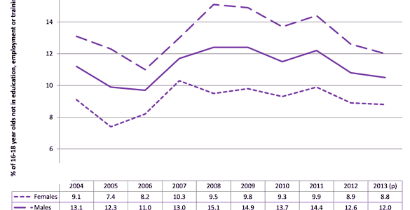 - NEET rates continue to be higher amongst females than males at age 19-24, although females experienced a larger percentage point reduction in 2013.