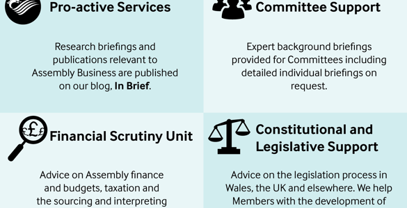 The National Assembly for Wales’ Research Service is made up of subject specialists who offer direct in-house research support and advice on a broad range of subjects to Assembly Members. They do this via three main services;