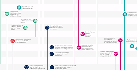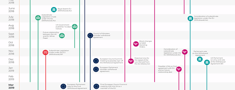 Since the last iteration of the timeline in May, the UK Government has published its vision for a future relationship with the EU and published a series of ‘technical notices’ on no-deal preparations. The UK and Welsh Governments have also started to introduce laws and regulations in relation to Brexit. However the date for the final sign off the Withdrawal Agreement is yet to be confirmed, but is now expected to be in December. It is largely recognised that the majority of the Withdrawal Agreement has been agreed, but there are ongoing negotiations regarding the border on the island of Ireland. Alongside the Withdrawal Agreement there will be a Political Declaration on the future relationship between the EU and UK. This declaration will have no legal effect.