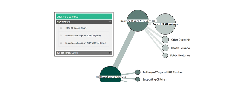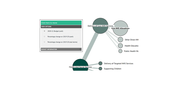 Under ‘view options’, you can select a comparison of the Budget with the previous financial year (the Second Supplementary Budget 2019-20). Cash or real-terms percentage change can be displayed.