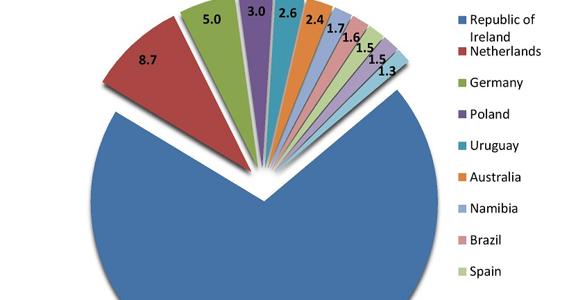 Data source: HCC[/caption] According to HCC, the declines in price were caused by an increase in the UK’s supply of prime cattle and an increase in imports, as well as subdued consumer demand. Whilst in the first three months of the year the number of prime cattle passing through abattoirs increased by 1% compared to last year, there was a 7% drop in purchases, pointing towards an increased volume of supply. HCC Chief Executive Gwyn Howells said: “The HCC review will look at all options to ensure that the Welsh beef herd has a viable and sustainable long term future.  It is in everyone’s interests – farmers, processors and retailers – to have a thriving beef industry in this country to satisfy the growing demand for high quality home-grown beef. All sections of the supply chain should work in harmony to achieve this aim.” The review will investigate whether the decline in Welsh beef prices might be influenced by an increase in imported Irish beef. Irish producers receive 310p per kg of beef and are a cheaper source of beef for processors. Beef imports increased in the first two months of 2014, especially from Republic of Ireland and the Netherlands. The Republic of Ireland is the largest source of imported beef in the UK by a considerable margin – in 2012, 159,800 tonnes of Irish beef were imported into the UK, representing over two-thirds of beef imports. The specific deadlines for the review have yet to be announced. The following pie chart shows the contribution of beef imports from the Republic of Ireland to the UK market relative to the other major sources of beef imports.  The announcement of the review by HCC was well received by the Farmers’ Union for Wales (FUW). FUW Vice President Brian Thomas said that declines in receipts for steers were eroding farmers’ confidence in the industry and investment may be needed to ensure the long-term viability of the industry. In response to the general decline in prices, NFU Cymru said in February that the sustainability of the Welsh beef market was being threatened and that operators across the supply chain should do more to assist farmers. “The decline could not have come at a worse time, with production costs continuing to escalate on the back of increased feed and bedding costs, as a result of this winter’s bad weather,” said NFU Cymru county chairman for Clwyd Ivor Beech.
