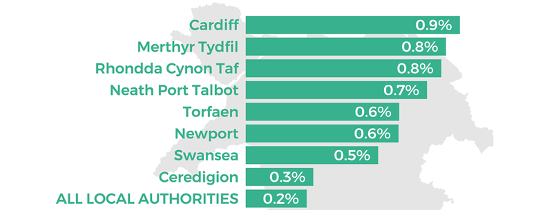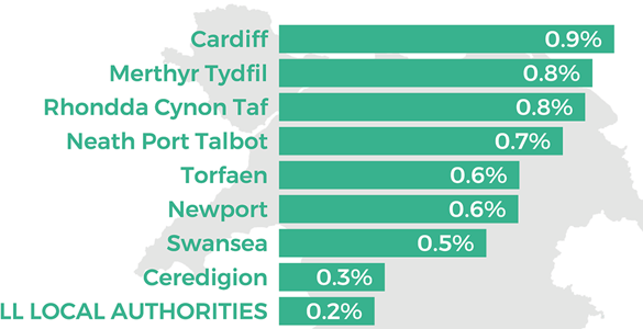 The largest increase compared to 2018-19 is 0.9% in Cardiff and the largest decrease is -0.3% for five local authorities (Isle of Anglesey, Conwy, Flintshire, Powys and Monmouthshire).