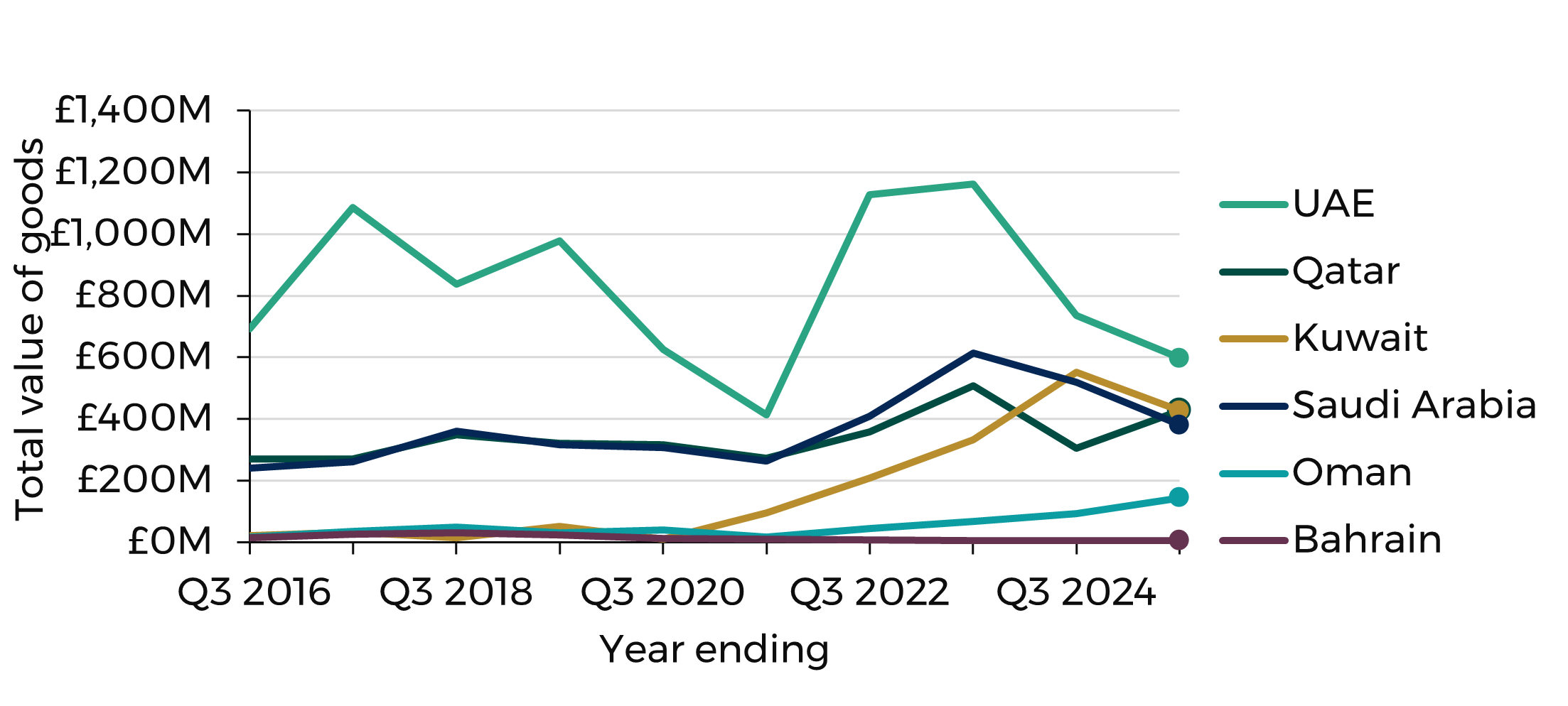 The graph below compares the latest value in trade between Wales and each individual GCC state, with previous periods.