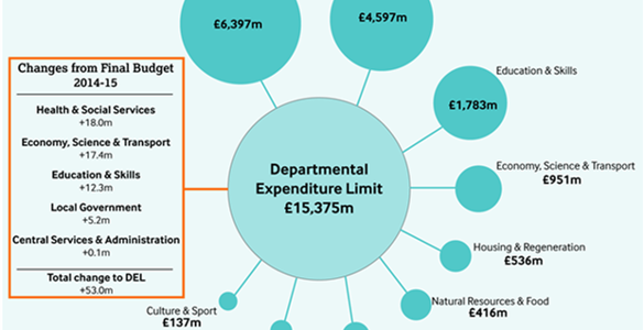 The allocation of discretionary expenditure (‘Departmental Expenditure Limit’) between different Welsh Government departments in the Supplementary Budget 2014-15 is summarised below. Total DEL has increased by £53 million, or 0.3%, relative to the 2014-15 budget approved by the Assembly in December 2014.