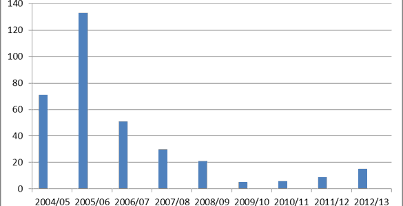 Natural Resources Wales (previously Environment Agency Wales) monitors the number of planning applications for development in flood risk areas that are granted (although not all necessarily built) by Local Planning Authorities contrary to its advice. Although the number of such cases has fallen significantly from a peak in 2005/06 there are signs of a small increase over the last couple of years.