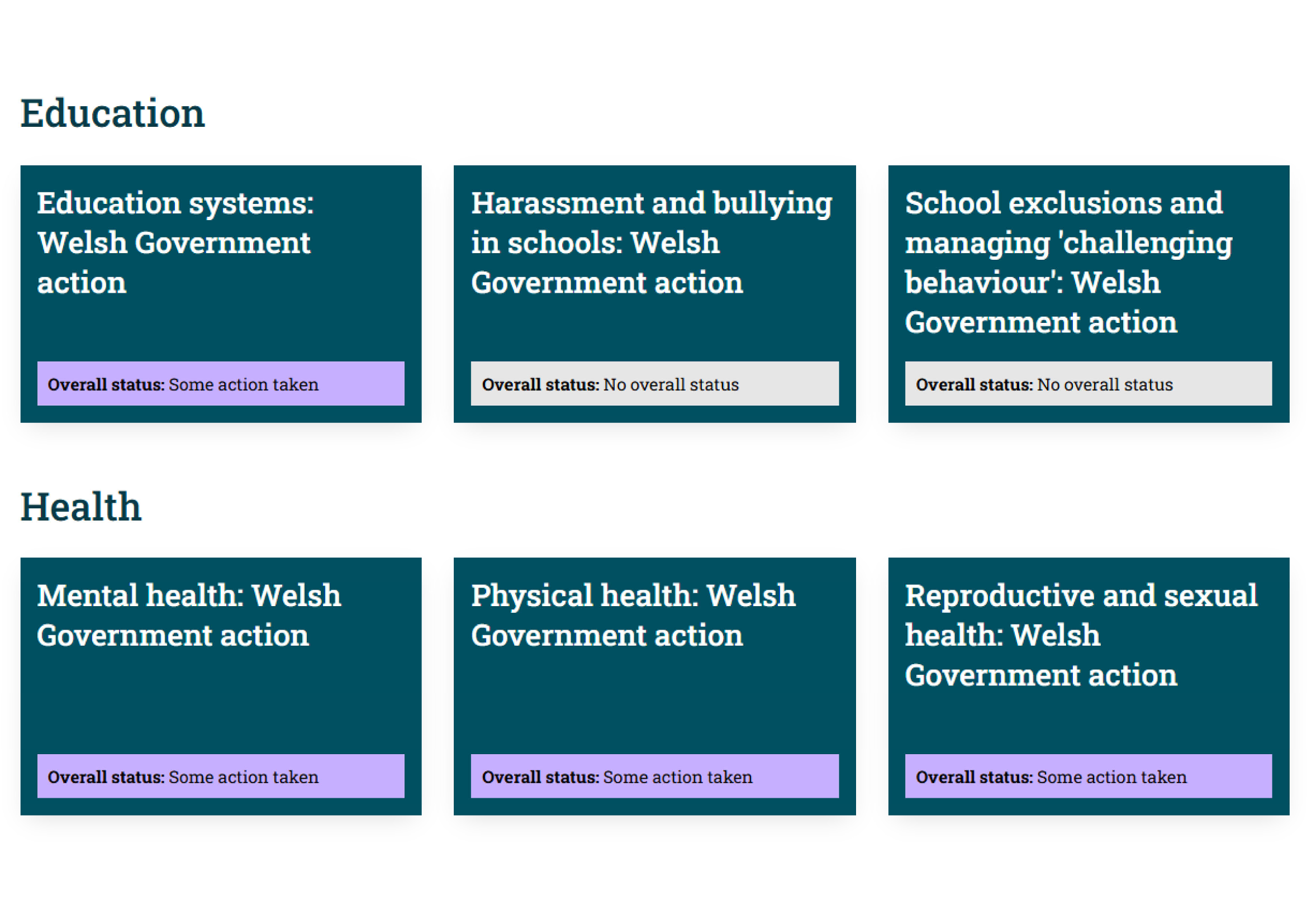 Senedd Members and civil society can check what’s been done across various thematic areas that impact people’s daily lives. They can also see all the recommendations made to the UK during UN treaty reviews since 2016 – available in Welsh too - and find out how to input to future review processes.