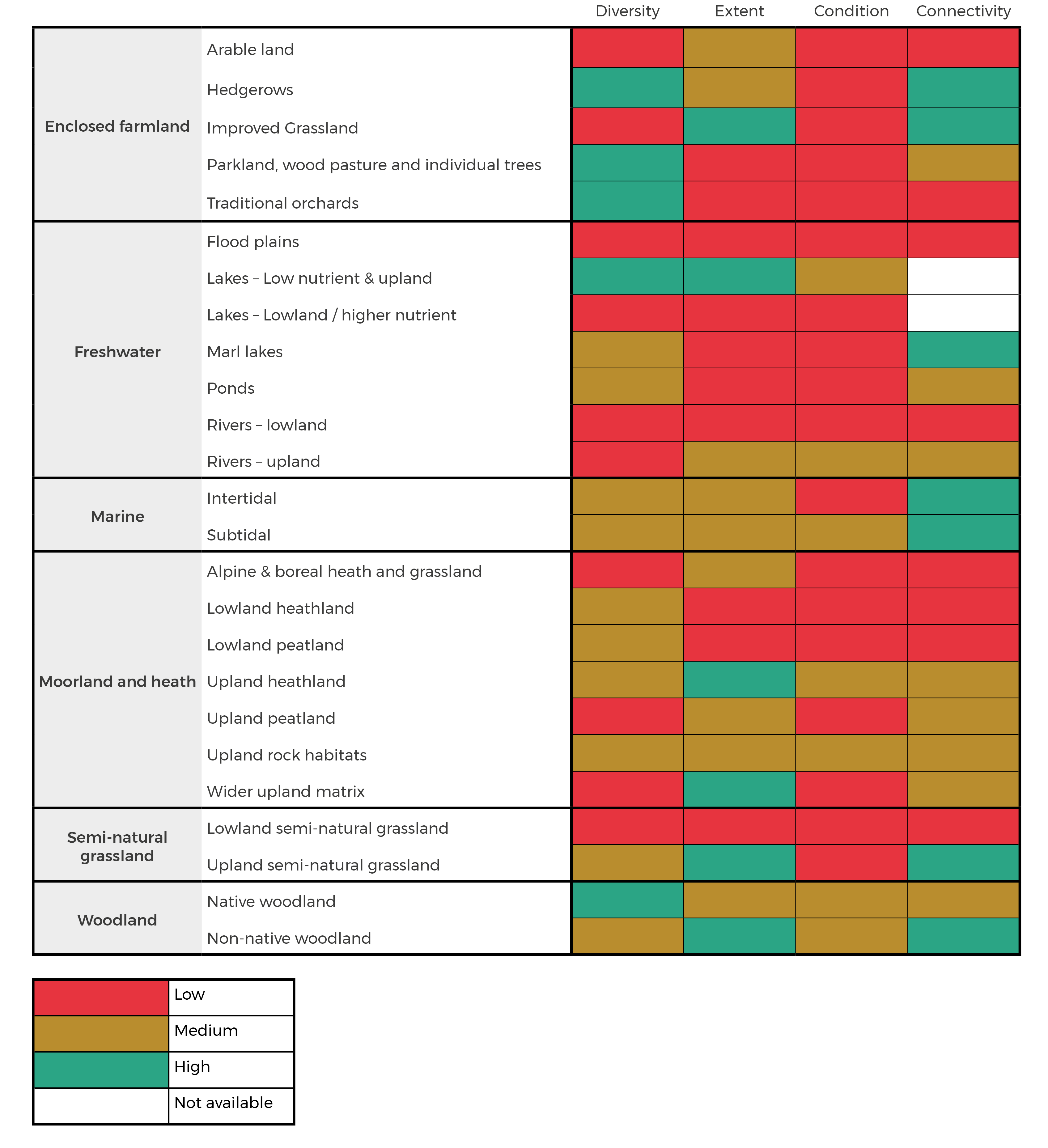 Figure 1. A matrix to indicate the resilience of ecosystems across various habitats in Wales using the resilience indicators of diversity, extent, condition and connectivity. Data source SoNaRR 2025, NRW.