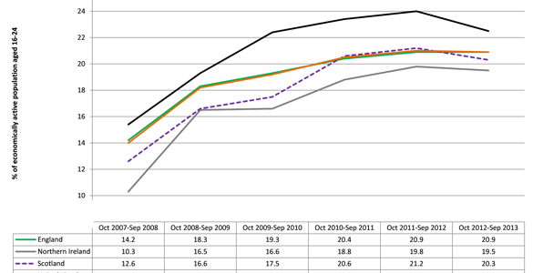 Figure 1: ILO unemployment rates for people aged 16 to 24 in UK nations[/caption] Source: Office for National Statistics, NOMIS – Official Labour Market Statistics Meanwhile, the latest quarterly statistics on young people not in education, employment or training were published by the Welsh Government on 16 January 2014. These statistics are slightly different to the youth unemployment statistics for the reasons outlined below: