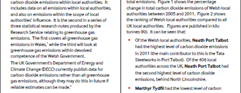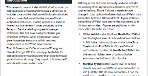 National Assembly for Wales Research Service This research note includes statistical information on carbon dioxide emissions within local authorities. It includes data on all emissions within local authorities, and also on emissions within the scope of local authorities’ influence. It is the second in a series of three statistical research notes produced by the Research Service relating to greenhouse gas emissions. The first covers all greenhouse gas emissions in Wales, while the third will look at greenhouse gas emissions within devolved competence of the Welsh Government. Carbon dioxide emissions in Welsh local authorities