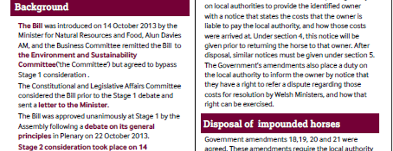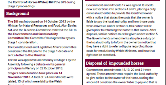 This document sets out the main changes made to the Control of Horses (Wales) Bill (‘the Bill’) during Stage 2 proceedings. Control of Horses (Wales) Bill: Summary of changes made at Stage 2