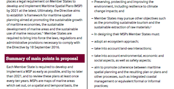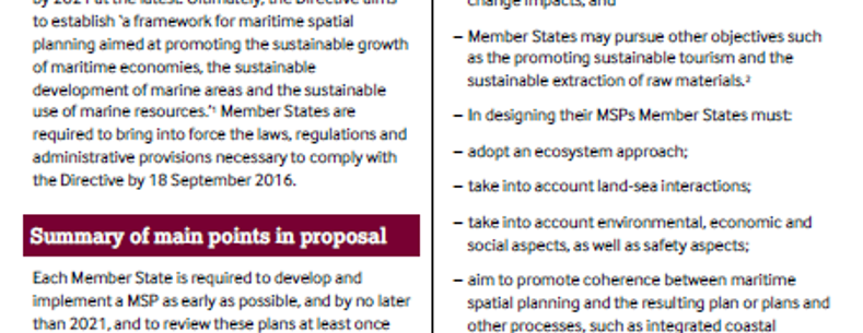 This EU Policy Update provides the latest information on Maritime Spatial Planning in the European Union. The content focuses on Directive 2014/89/EU and provides a summary of the main points of the Directive, the background context to the Directive and its relevance to Wales. EU Policy Update on Maritime Spatial Planning (PDF, 264KB)