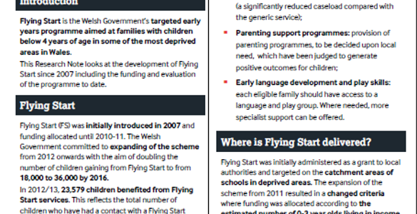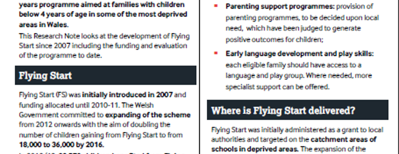 Flying Start is the Welsh Government’s targeted early years programme aimed at families with children below 4 years of age in some of the most deprived areas in Wales. This Research Note looks at the development of Flying Start since 2007 including the funding and evaluation of the programme to date. Flying Start