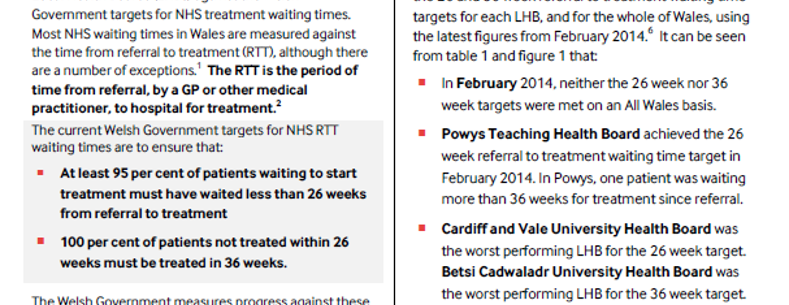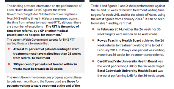 This briefing provides information on the performance of Local Health Boards (LHBs) against the Welsh Government targets for NHS treatment waiting times. Most NHS waiting times in Wales are measured against the time from referral to treatment (RTT), although there are a number of exceptions NHS Referral to Treatment Waiting Times