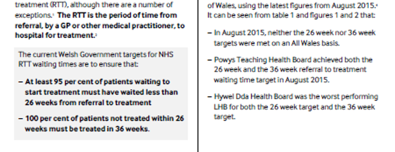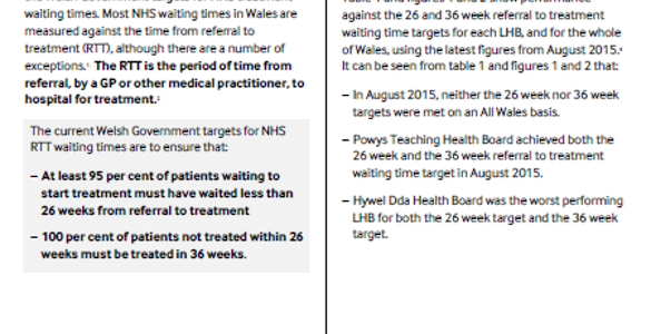 This briefing provides information on the performance of Local Health Boards (LHBs) against the Welsh Government targets for NHS treatment waiting times. Most NHS waiting times in Wales are measured against the time from referral to treatment (RTT), although there are a number of exceptions. NHS Referral to Treatment Waiting Times (PDF, 879 KB)