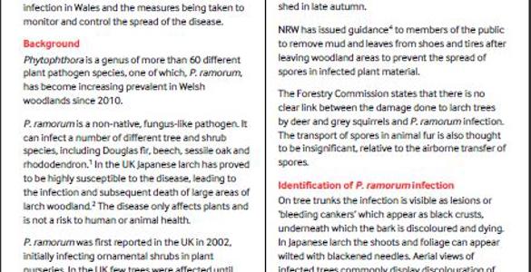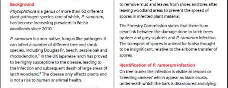 This research note provides a summary of the extent of the Phytophthora ramorum (P. ramorum) infection in Wales and the measures being taken to monitor and control the spread of the disease. Phytophthora ramorum (PDF, 396.9 KB)