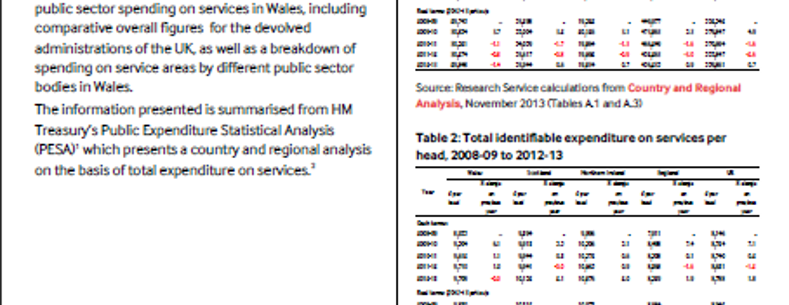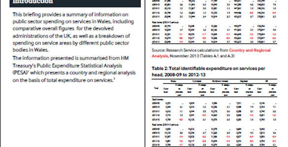 This briefing provides a summary of information on public sector spending on services in Wales, including comparative overall figuresĀ for the devolved administrations of the UK, as well as a breakdown of spending on service areas by different public sector bodies in Wales. Public Spending in Wales