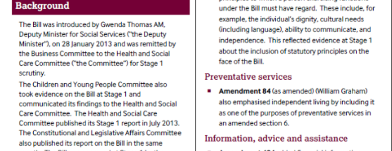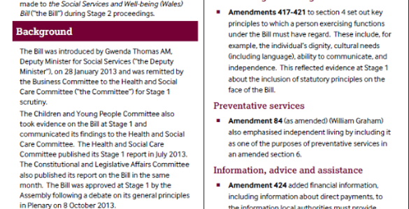 This document sets out the main changes made to the Social Services and Well-being (Wales) Bill (‘the Bill’) during Stage 2 proceedings. Social Services and Well-being (Wales) Bill: Summary of changes at Stage 2