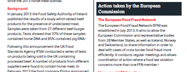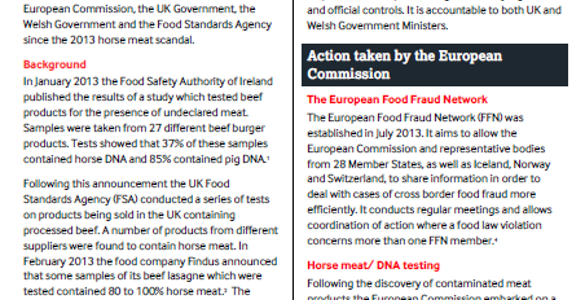 This research note outlines the measures taken to prevent future cases of meat contamination by the European Commission, the UK Government, the Welsh Government and the Food Standards Agency since the 2013 horse meat scandal. The Horsemeat Scandal: Progress Made