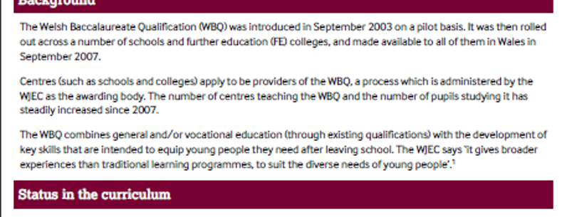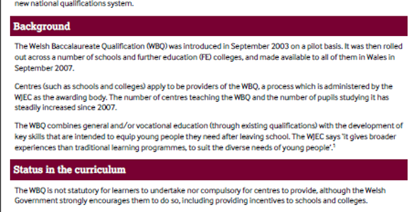 This Quick Guide sets out what is currently included in the Welsh Baccalaureate and what is changing from September 2015 when a new version of the qualification is being introduced. This follows a recommendation from Huw Evans’ Review of Qualifications for 14 to 19 year olds in Wales that a new, revised and more rigorous Welsh Baccalaureate be established at the heart of Wales’ reformed qualifications system.