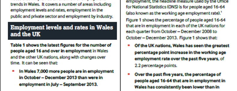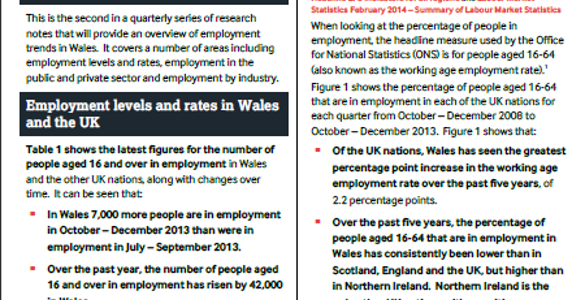 This is the second in a quarterly series of research notes that will provide an overview of employment trends in Wales. It covers a number of areas including employment levels and rates, employment in the public and private sector and employment by industry. The Welsh Workforce – Employment in Wales