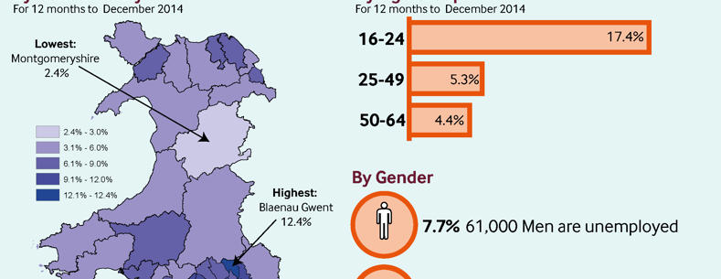 - 69.4% of people in Wales aged 16-64 are in work in January to March 2015, although the working age employment rate has decreased over the past year; and