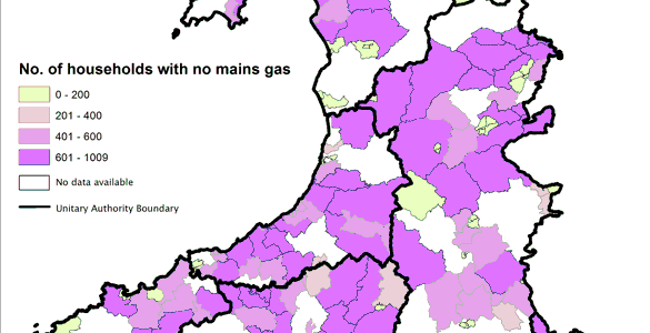 Fuel poverty is defined as needing to spend more than 10% of household income on energy in order to heat the home to an acceptable level. In 2008, 332,000 households in Wales were estimated to be fuel poor. In rural Wales the proportion of households in fuel poverty was 42 per cent in 2008; almost double that of fuel poverty in urban areas, which was 22 per cent. Rural households often use fuels other than gas to heat their homes as they are more likely to be off the gas mains network. The Welsh Government estimates that the total number in fuel poverty in Wales had increased by an additional 54,000 to 386,000 households in 2012. The Department of Energy & Climate Change (DECC) has recently produced some estimates of the number of households who don’t have access to the gas mains network across Great Britain. It estimates that 15% of all households didn’t have access to mains gas in Wales in 2012 (about 195,000 households). According to DECC this compares to an average of about 10% for England, 18% for Scotland and 11% for Great Britain as a whole. The Welsh Government’s own estimate of the number of properties without mains gas in Wales is somewhat higher at about 264,500 dwellings. The map below shows the estimated number of households by 2011 Census Lower Super Output Area (LSOA) that were not connected to the gas network in 2012. Note that for a few LSOAs no data is available.
