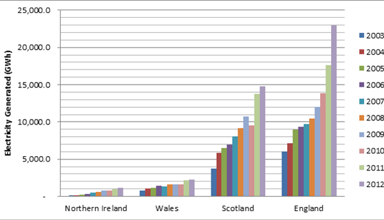 Electricity generated from renewable resources increased by 9% between 2012-2013 in Wales. The increases in Scotland, Northern Ireland and England were 16%, 30% and 41% respectively.