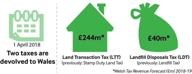 The Wales Act 2014 made provision for a range of taxes to be devolved to the Welsh Government. In April 2018, Wales will take control of Land Transaction Tax (LTT) and Landfill Disposals Tax (LDT).