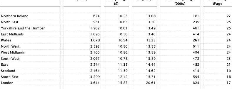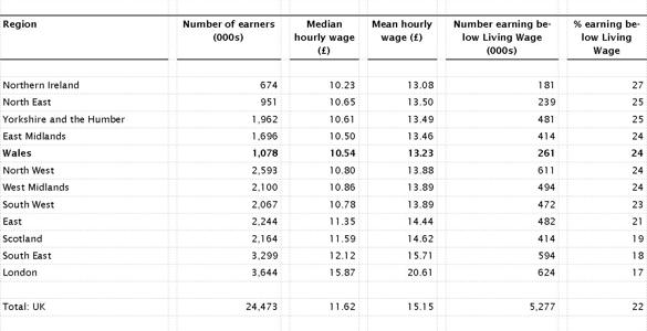 This week, as part of Living Wage Week, the Living Wage Foundation announced that the Living Wage for 2014-15 is £7.85. This is an increase of 2.6 per cent from last year’s figure of £7.65. Supporters argue that the voluntary Living Wage is a key weapon in the fight against rising in-work poverty, both in Wales and the UK. The Living Wage, calculated by academics at Loughborough University, is intended to reflect the amount of money an individual needs to earn to live a decent life. As opposed to the National Minimum Wage, it is a voluntary measure that employers choose to adopt, rather than enforceable by law (more information is available in a Research Paper published by the Research Service, The Living Wage: Questions and Answers, though this document does not reflect the new rate or most recent statistics). As the table below shows, a study has found that Wales is the region in the UK with the fifth largest proportion of workers receiving less than the Living Wage, at 24 per-cent of those in employment (Northern Ireland had the largest, at 27 per-cent). This is 1 per-cent lower than last year’s figure of 25 per cent.