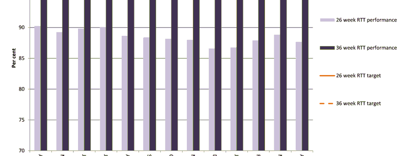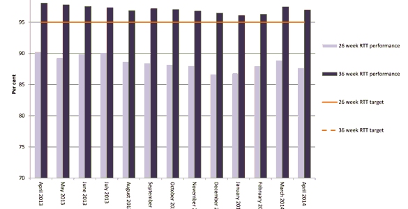 The 26 week target has not been met since August 2010, while the 36 week target has not been met since December 2009. The latest figures show that 87.7% of patients had been waiting less than 26 weeks from referral to treatment at the end of April 2014, while 97% of patients had been waiting less than 36 weeks. Performance over the last year is shown in figure 1.